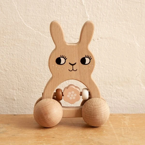 Met de Roommate Bunny Houten Rammelaar kan je kindje lekker rammelen en spelen. De rammelaar is gemakkelijk vast te pakken met kleine kinderhandjes en heeft de vorm van een schattig dier. Wanneer je de rammelaar heen en weer beweegt zal het vrolijk rammelen, dit zal je kindje erg interessant vinden. De houten kraaltjes in de buik van het dier kunnen ronddraaien en zorgen voor het rammel-geluid. Ook is de rammelaar voorzien van wieltjes. Verder is de vrolijke rammelaar gemaakt van hoogwaardig materiaal.