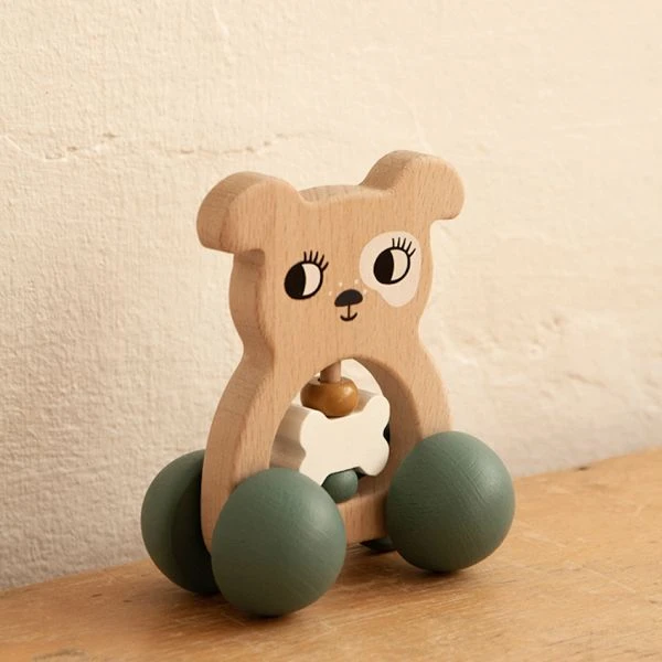 Met de Roommate Dog Houten Rammelaar kan je kindje lekker rammelen en spelen. De rammelaar is gemakkelijk vast te pakken met kleine kinderhandjes en heeft de vorm van een schattig dier. Wanneer je de rammelaar heen en weer beweegt zal het vrolijk rammelen, dit zal je kindje erg interessant vinden. De houten kraaltjes in de buik van het dier kunnen ronddraaien en zorgen voor het rammel-geluid. Ook is de rammelaar voorzien van wieltjes. Verder is de vrolijke rammelaar gemaakt van hoogwaardig materiaal.