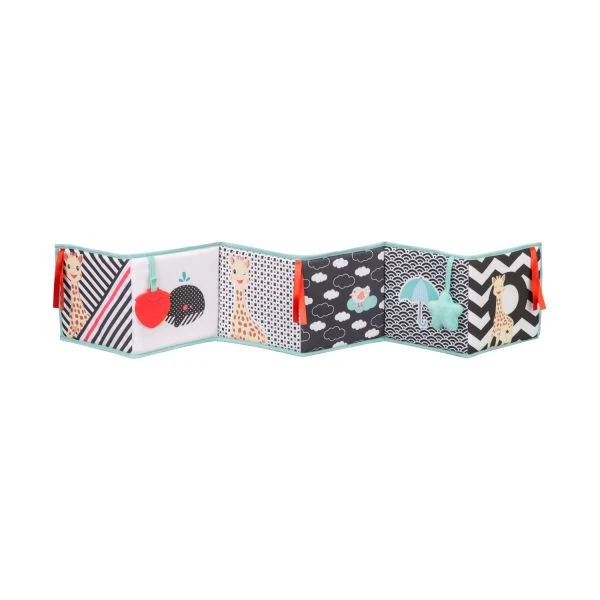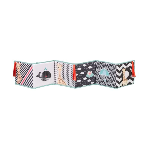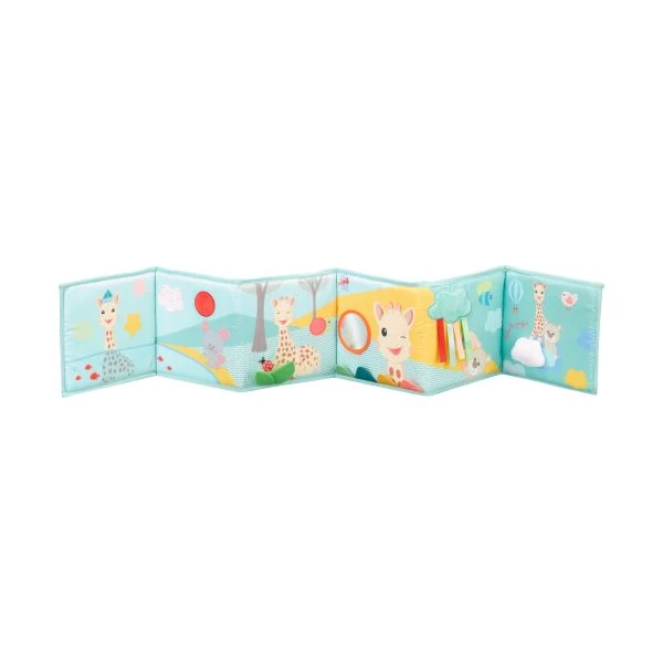 Het Sophie De Giraf Opvouwbaar Speelboek is een vrolijk boekje vol met leuke afbeeldingen voor je kindje. Het dubbelzijdige boekje bevat 12 pagina’s vol met afbeeldingen en activiteiten zoals een spiegeltje, kleurrijke lintjes, belletjes en structuren. De kleurtjes en geluidjes zullen je kindje uitdagen om met het boekje te spelen. Dankzij de handige lintjes kan het boekje vastgemaakt worden aan het bed of de box van je kindje.